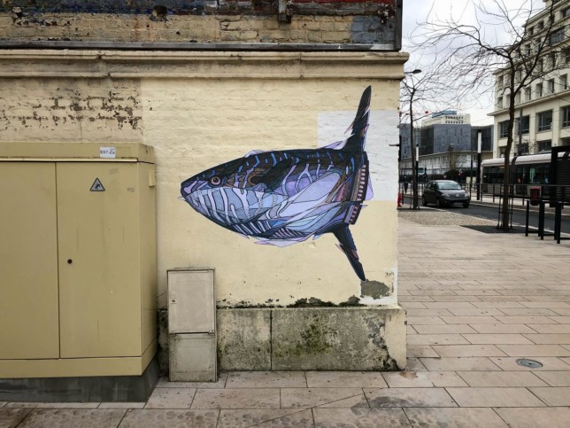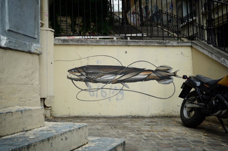Récemment exposé à la Galerie Hamon au Havre, d’où il est originaire, le street artiste Teuthis (« Calmar » en grec) réalise essentiellement des illustrations d’animaux marins à grande échelle, mêlant un style géométrique singulier et une approche naturaliste.