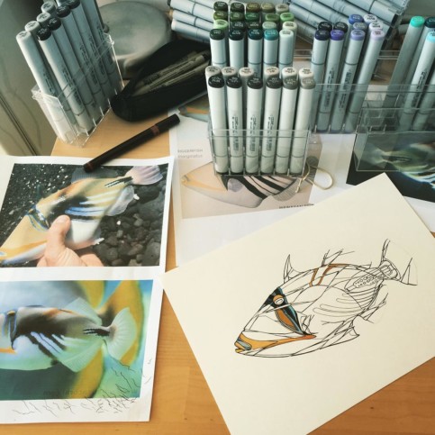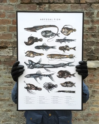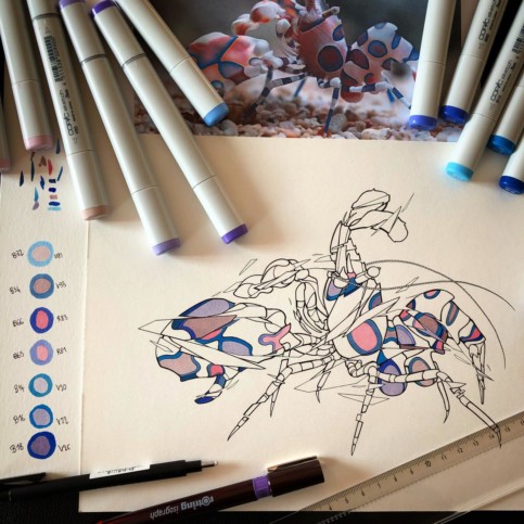 Je puise essentiellement mon inspiration dans les ouvrages scientifiques spécialisés (illustrations anatomiques, gravures, descriptions d’espèces…) et dans les clichés de photographes sous-marins (via internet). De nombreux artistes m’ont influencés, impossible de tout citer mais voilà une sélection : le naturaliste havrais Charles Alexandre Lesueur (pour la finesse de ses traits), les gravures d’Ernst Haeckel (pour le mélange science/art), le street-artiste Roa (pour sa faune urbaine démesurée)…