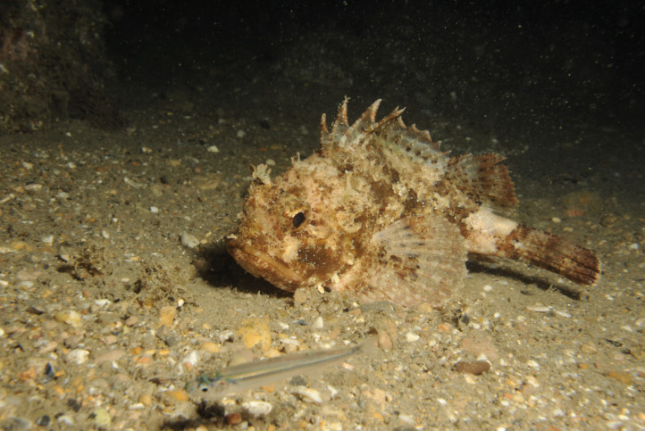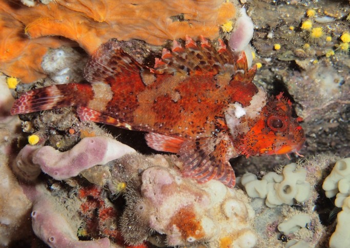 Comme chez les autres rascasses, ce petit prédateur passe ses journées camouflé dans les fonds rocheux.