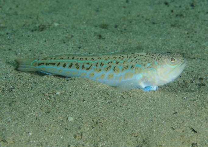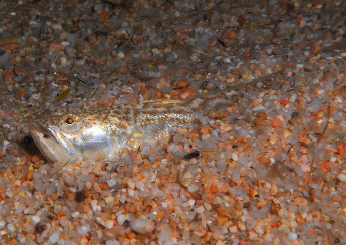 D’une longueur commune d’à peine 10 cm, la petite vive passe ses journées semi-enfouie dans le sable, ne laissant dépasser que ses yeux et ses épines dorsales venimeuses.