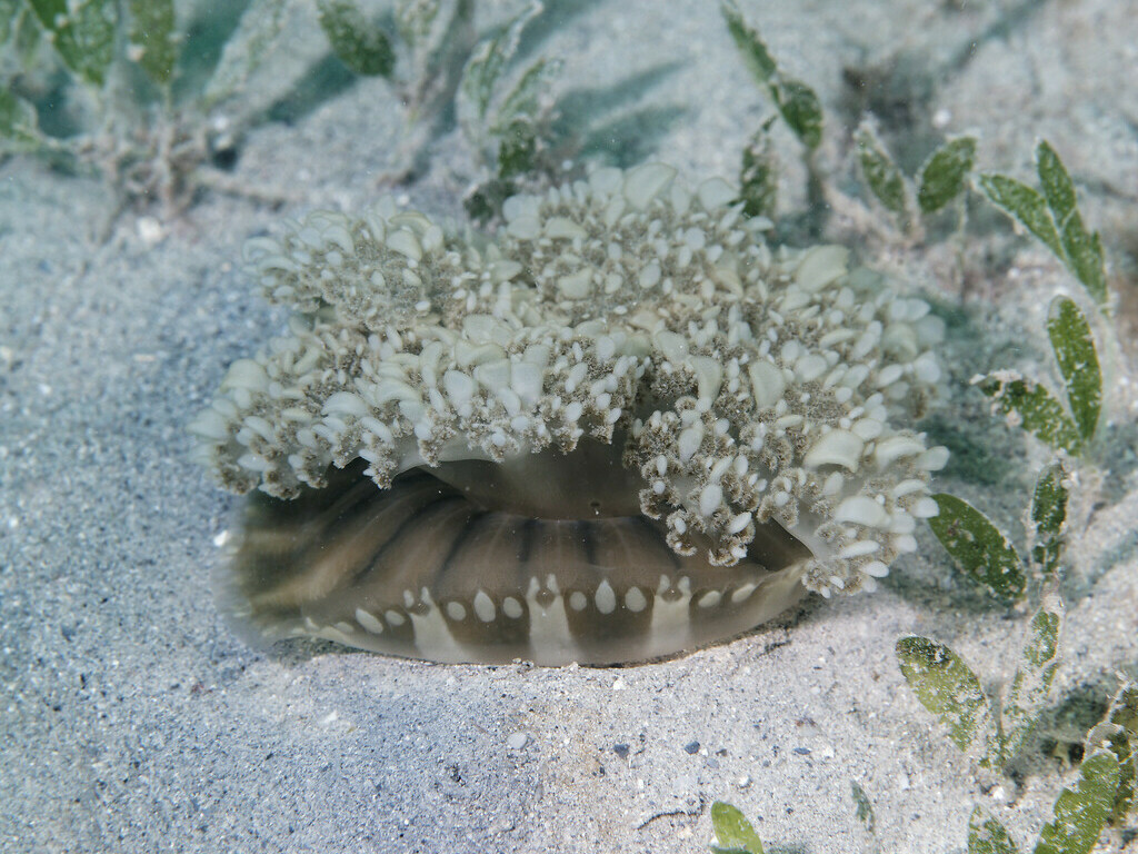 Cassiopea andromeda measures between 12 and 30 cm. This cnidarian is bicolore with a predominantly vert and rose body.