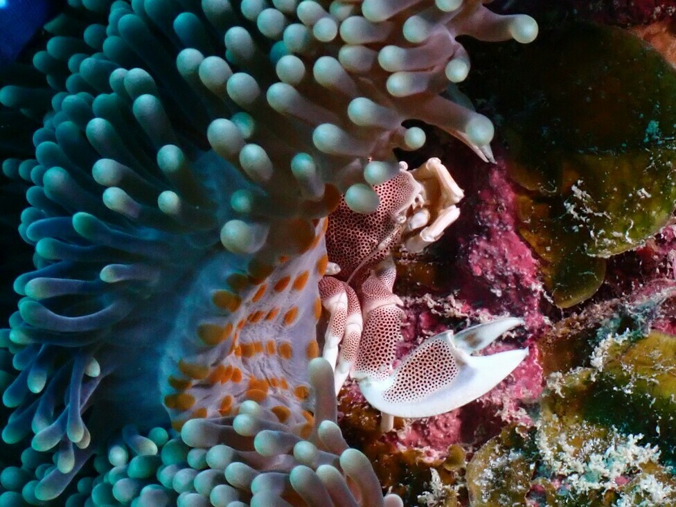 Neopetrolisthes maculatus measures between 3 and 7 cm. this crustacea is unicolore with a predominantly beige body. The also has rouge ponctuations.
