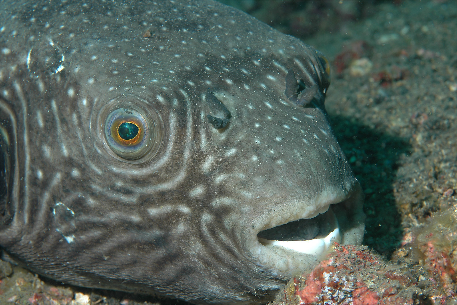 This species belongs to the group of pufferfish. These fish are nicknamed like this because they have the ability to inflate themselves when they feel threatened.