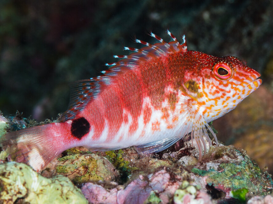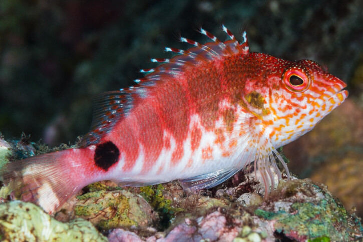 Cirrhitops mascarenensis measures between 6 and 7.5 cm. This fish is bicolore with a predominantly rouge and blanc body. The also has rouge vertical stripes.