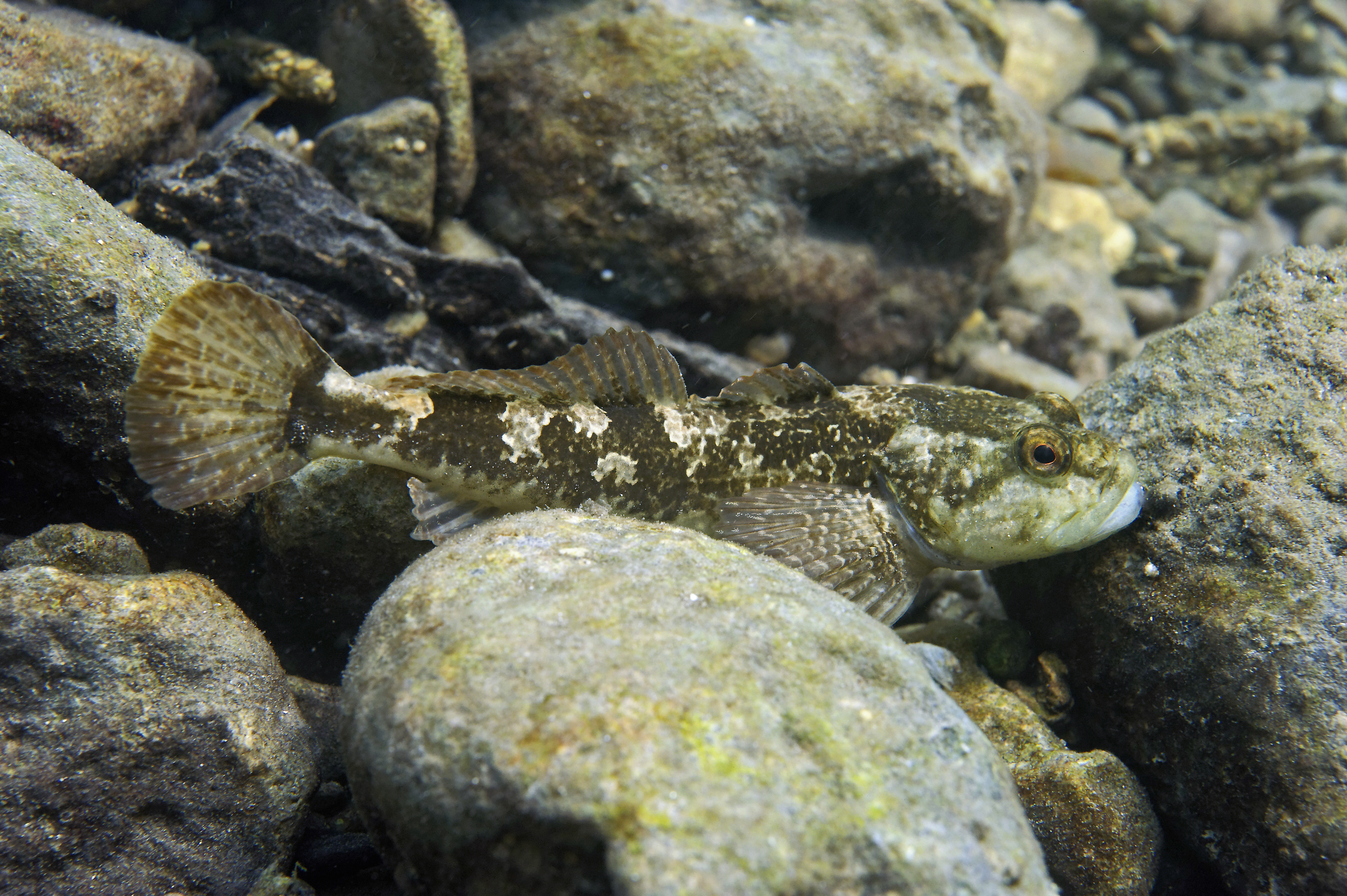 The bullhead typically has a spotted or marbled brown coloration that allows it to blend in with the riverbed.
