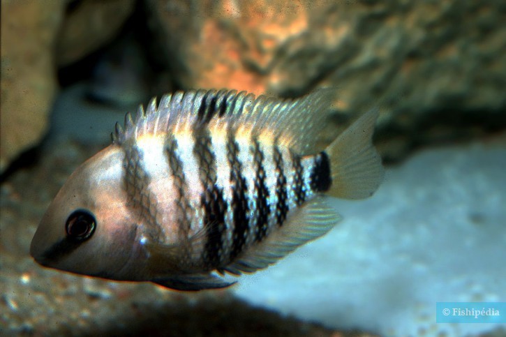 The blue-eye cichlid measures between 7 and 13 cm. This fish is unicolore with a predominantly bleu body. The also has noir vertical stripes.