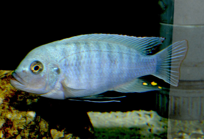 Maylandia aff. zebra "Chizumulu" measures between 12 and 13 cm. This fish is unicolore with a predominantly bleu body.