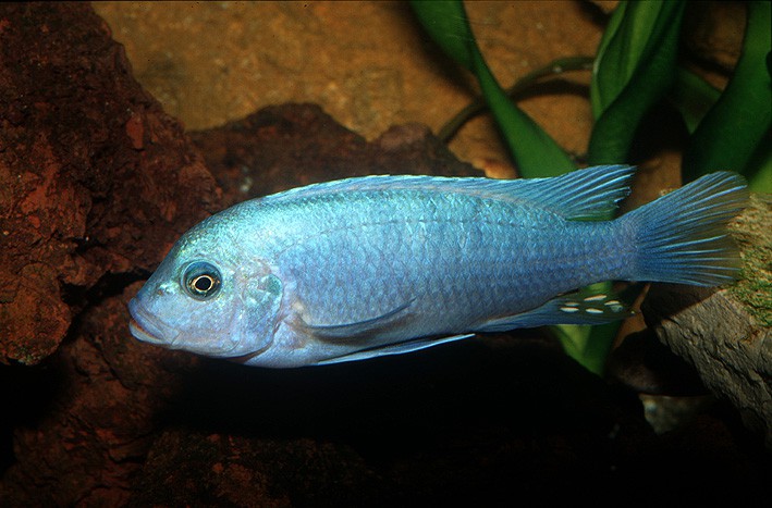Maylandia callainos measures between 7 and 8 cm. This fish is unicolore with a predominantly bleu body.