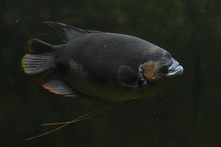 The giant gourami measures between 45 and 70 cm. This fish is unicolore with a predominantly gris body.