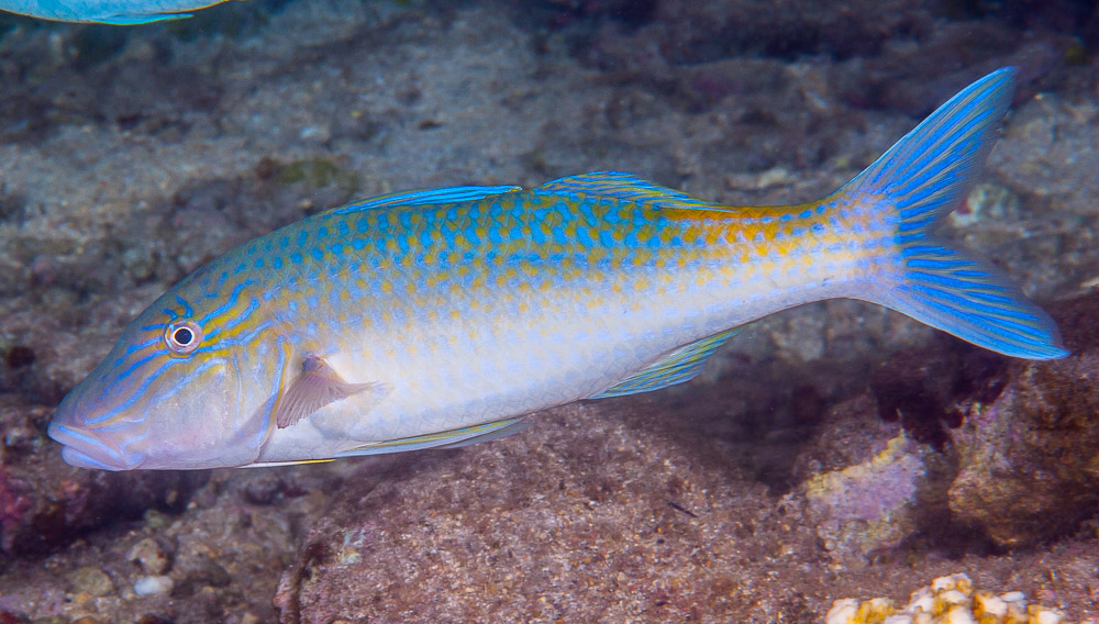 The gold-saddle goatfish measures between 35 and 50 cm. This fish is unicolore with a predominantly jaune, bleu and gris body.