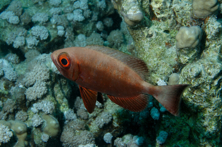 The moontail bullseye measures between 40 and 45 cm. This fish is unicolore with a predominantly rouge body. The also has rouge vertical stripes.