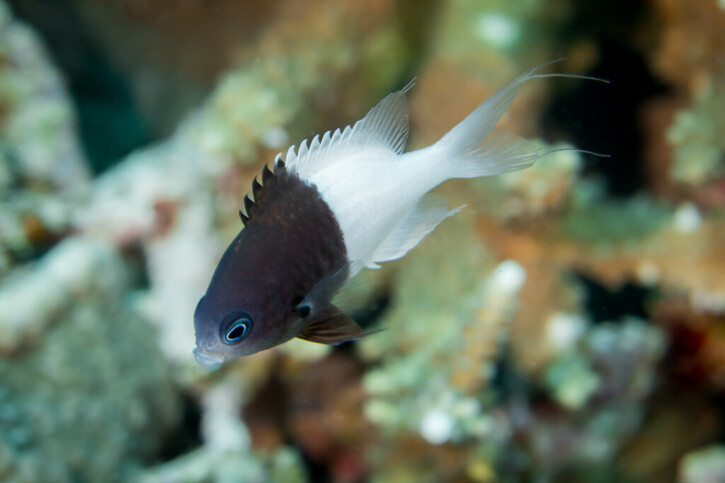 Pycnochromis iomelas measures between 6 and 8 cm. This fish is bicolore with a predominantly noir and blanc body.