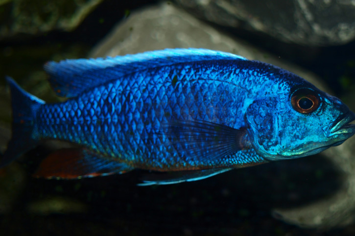 Sciaenochromis fryeri measures around 11 cm. The dominant males can however reach 12 cm. This fish is unicolore with a predominantly bleu body.