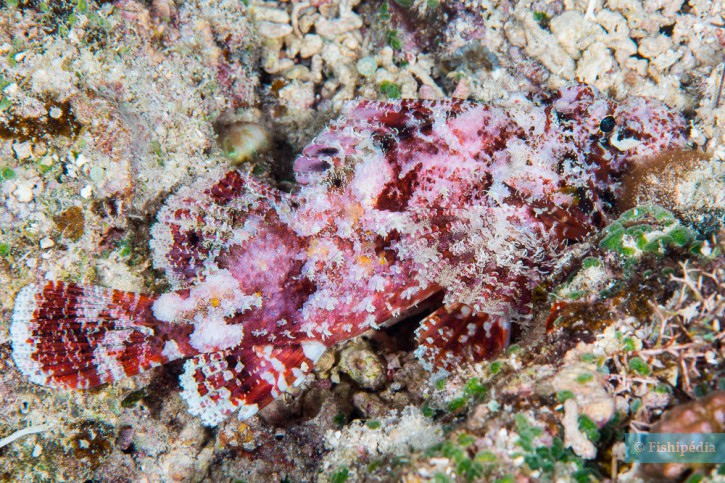 The color of this fish varies depending on the substrate but it is commonly seen in dark brown to red tones with lighter spots. Its mouth is typical of ambush predators, protractile and inclined upwards.