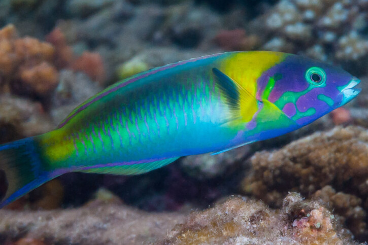 Thalassoma genivittatum measures around 15 cm. The dominant males can however reach 20 cm. This fish is multicolore with a predominantly jaune, bleu, vert, beige and violet body.