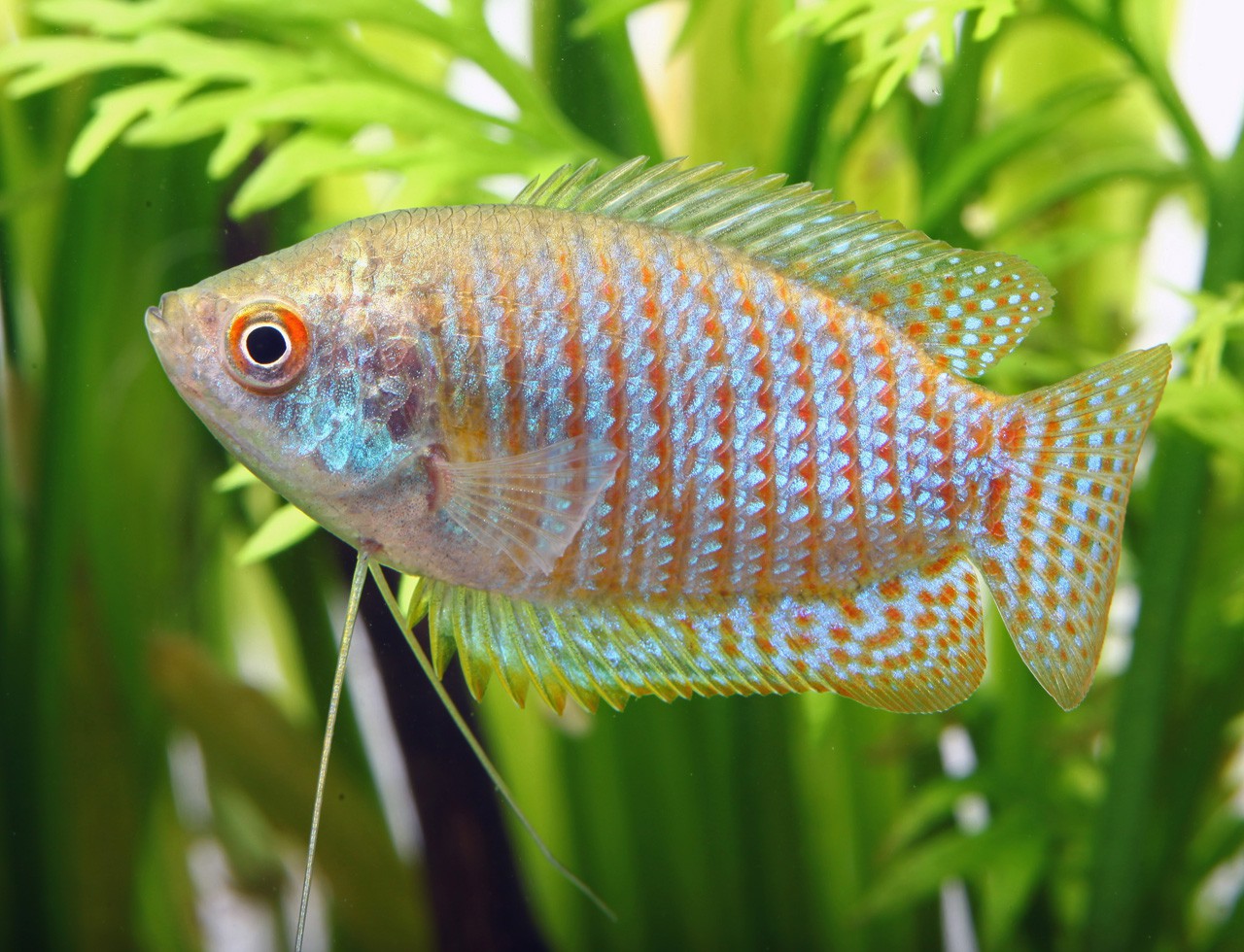 Like all fish of its genus, Trichogaster lalius has the particularity of being able to breathe in two different ways. In addition to the classic gills, this species is equipped with a breathing apparatus called Labyrinthe which allows it to absorb oxygen from the air. These species are commonly called the labyrinth Fish.