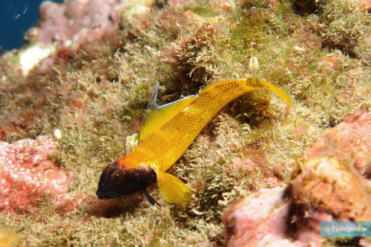 The black-faced blenny is two-colored with a black head and yellow body. Upon closer observation, brownish vertical stripes can be seen throughout the body. The head is covered with small shiny spots like other Tripterygion species.
