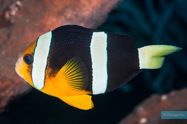 Le corps est noir avec une quantité variable d'orange au niveau de la tête, des nageoires et des parties ventrales. L'espèce possède communément trois bandes blanches sur le corps et une nageoire caudale blanche ou jaune. Sa large répartition géographique a induit de nombreuses variations de couleur en fonction de la région. Une exception est présente de Vanuatu à la Nouvelle-Calédonie : Les adultes et juvéniles peuvent y être totalement oranges avec seulement deux barres blanches.