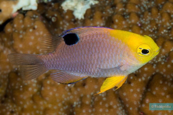 Le corps est majoritairement de couleur rose. La tête et les nageoires pelviennes sont jaunes vives. Une tache noire caractéristique est présente sur la dorsale.