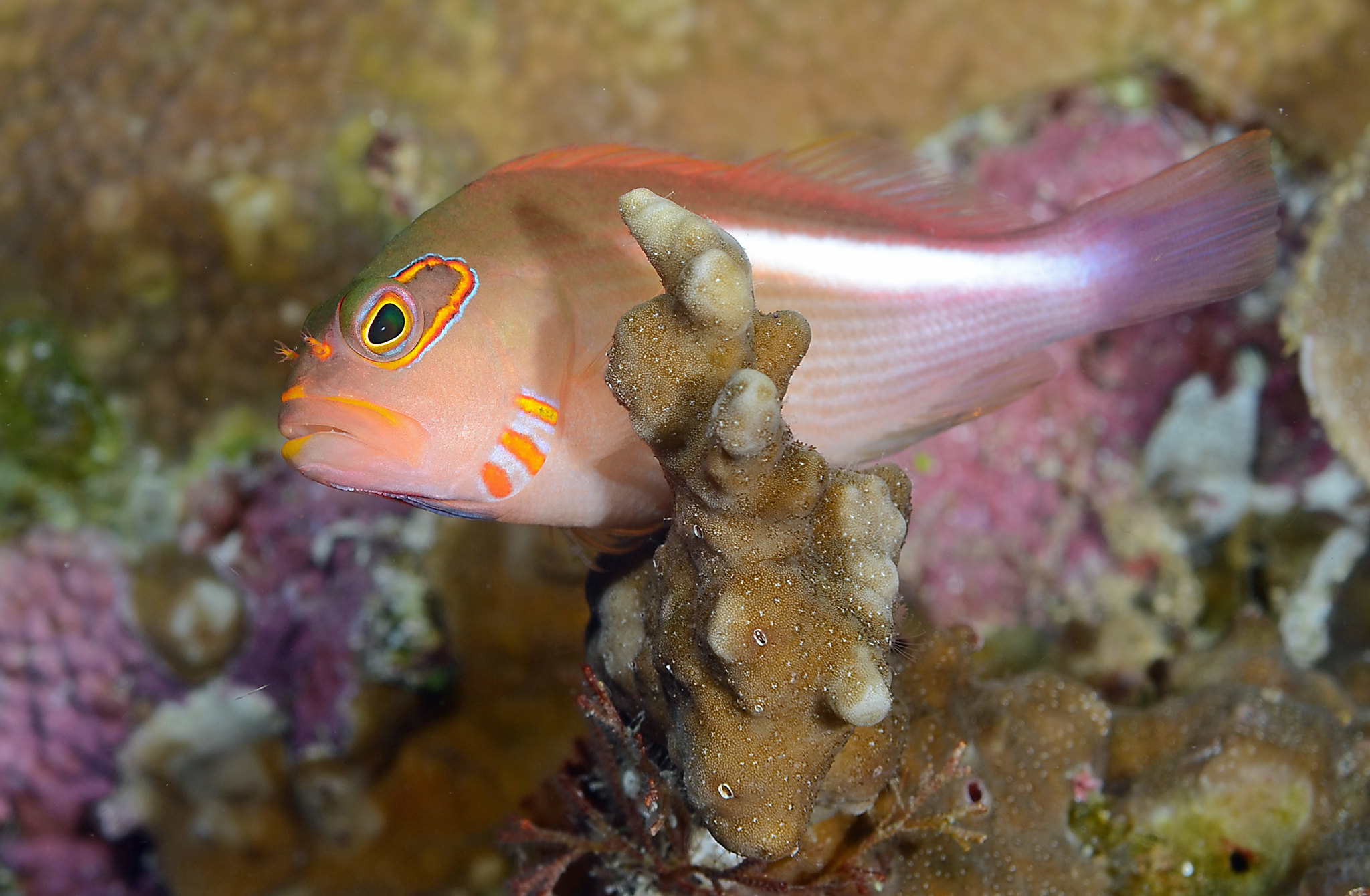 Paracirrhites arcatus, plus communément appelé épervier strié, est un petit prédateur marin vivant dans les récifs coralliens de la zone l'Indo-Pacifique.