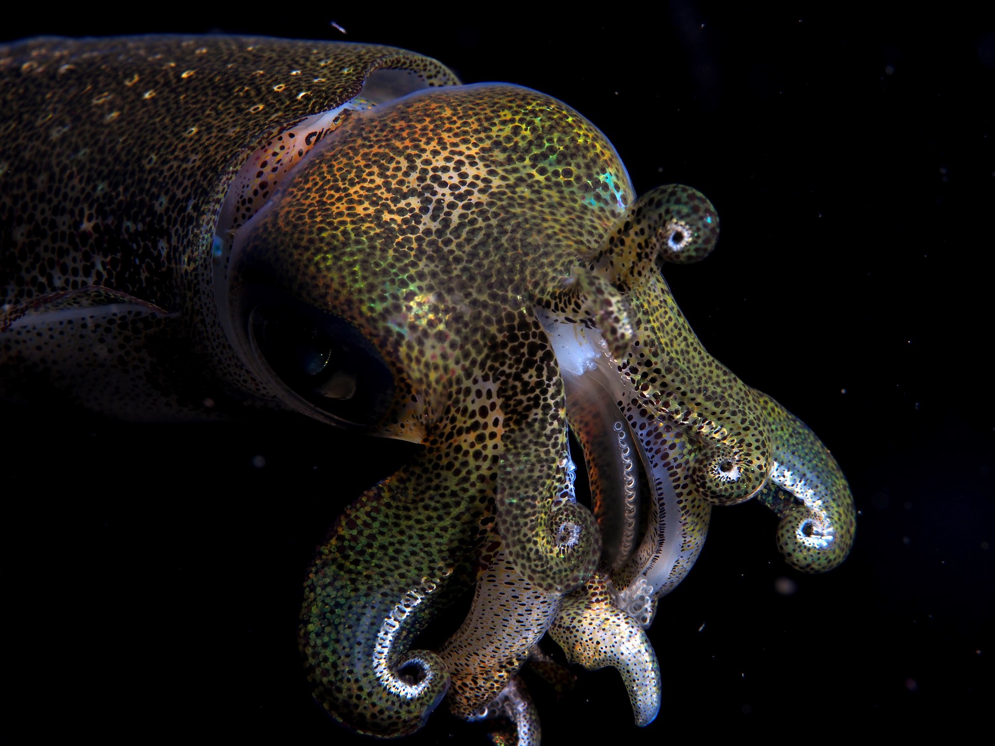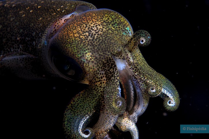 As for other squids, the eyes are dominating and give this species an excellent night vision. They are for that matter impressive night hunters. During the day, they stay hidden in the sandy bottoms. Like many cephalopods, they can change color to camouflage themselves or intimidate an intruder. Their main preys are fishes from shoals, such as anchovies or sardines.