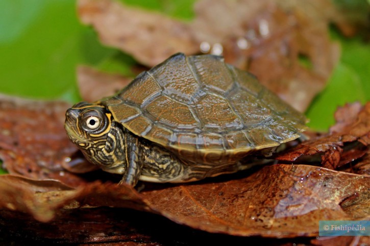 The mississippi map turtle measures between 9 and 15 cm. This reptile is tricolore with a predominantly jaune, orange and marron body. The also has jaune and orange multiple.