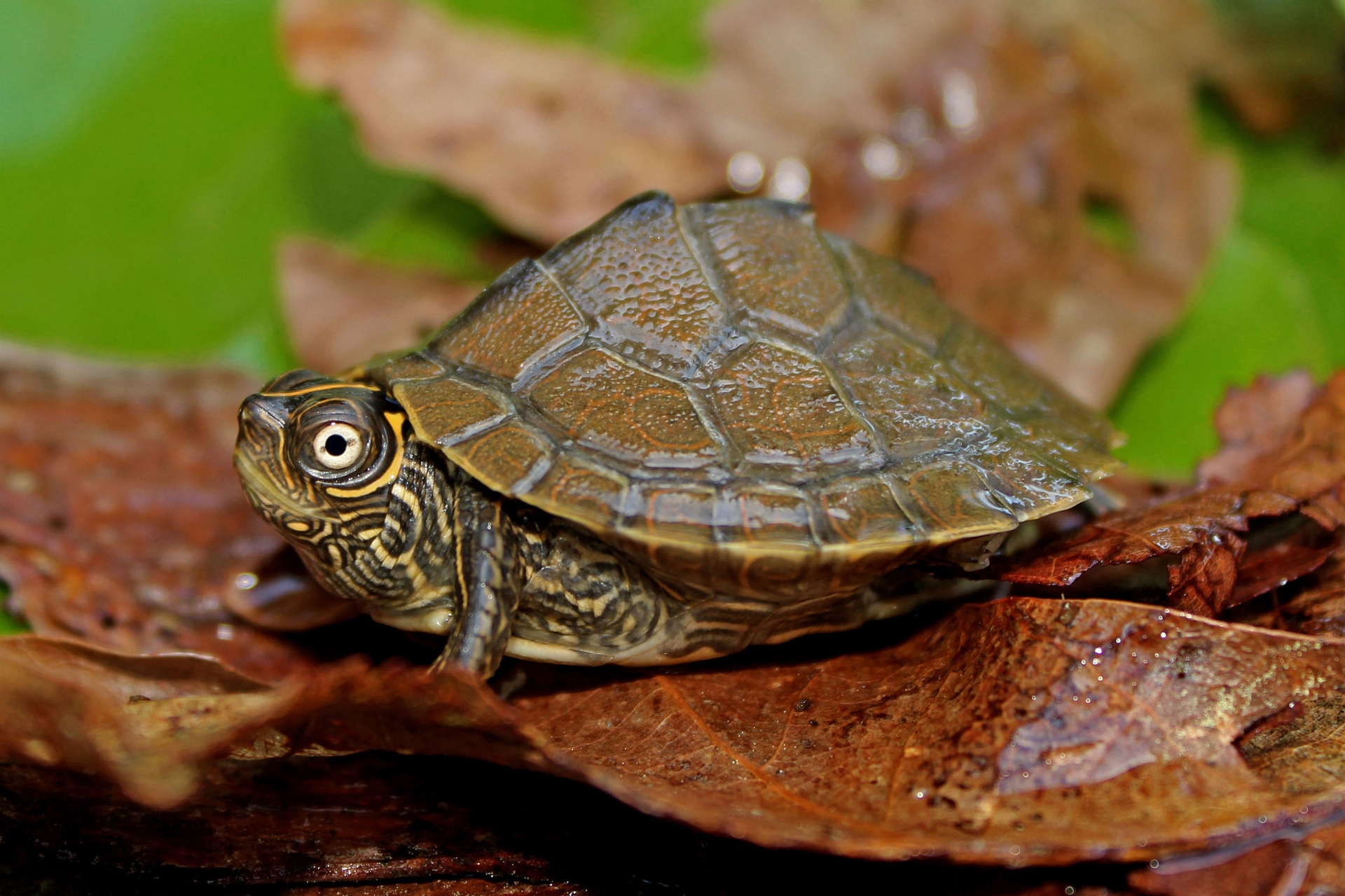 The mississippi map turtle is a reptile living in colonies naturally found in the vegetation. The members of each group are organized around a well established hierarchy. This species is omnivorous with carnivorous tendency .