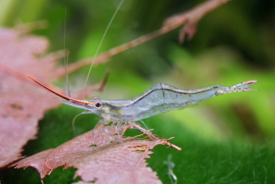 Neocaridina davidi ”Bloody Mary” is a crustacea living in colonies naturally found near the bottom. This species is scavenger . Measuring only a few centimeters, this small species tends to be discreet and hide in the presence of larger neighbors.