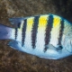 The sergeant major is tricolored with a predominantly blue, black, and white body. It is covered in black vertical stripes.