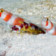 The pinkbar goby measures between 9 and 11 cm. This fish is bicolore with a predominantly orange and blanc body. The also has orange and blanc vertical stripes.