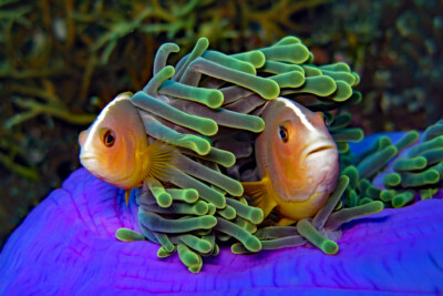 The barrier reef anemonefish is a fish living as a couple. This species is omnivorous with carnivorous tendency .