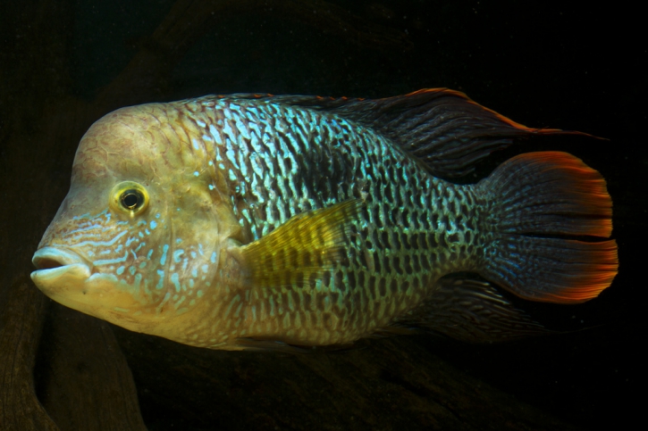 The green terror can reach a maximum size of about 20 cm. It has a shiny green and blue coloration, often highlighted by an orange border on the dorsal and caudal fins. Adult males are usually larger than females and may develop a frontal hump.