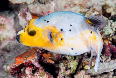 This species belongs to the group of pufferfish. These fish are nicknamed like this because they have the ability to inflate themselves when they feel threatened.