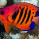 The flame angelfish is a fish living as a couple or in a group naturally found at mid-depth and near the bottom. This species is omnivorous with alguivorous tendency .