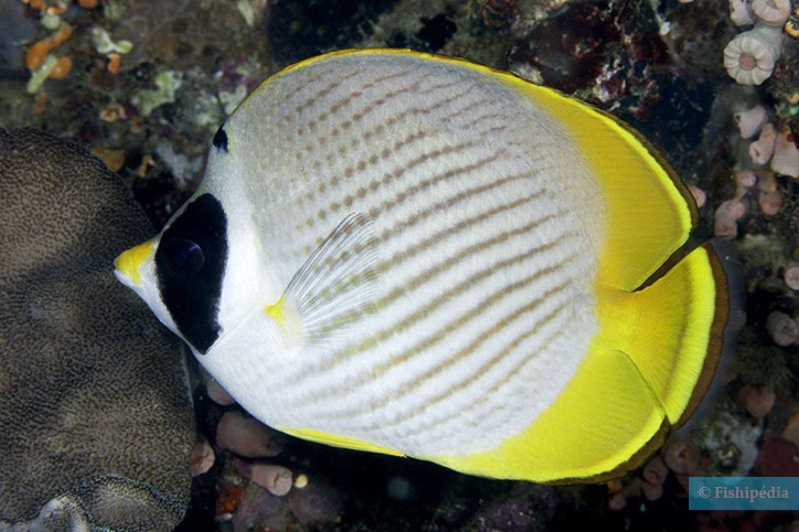 This species of butterflyfish is most commonly found at depths less than 30 meters. Adults live near coral reefs where they find their food, including corals, small crustaceans, and worms.