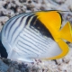 The threadfin butterflyfish is tricolored with a predominantly orange-yellow, black, and white pattern. It has diagonal stripes in both black colours.
