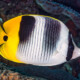 The double-saddle butterflyfish measures between 15 and 15 cm. This fish is tricolore with a predominantly jaune, noir and blanc body. The also has noir vertical stripes.