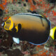 The conspicuous angelfish measures between 8 and 10 cm. This fish is bicolore with a predominantly jaune and noir body.