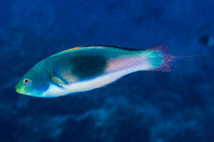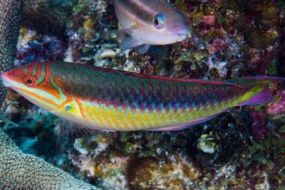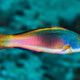 The scott's wrasse measures between 10 and 13 cm. This fish is multicolore with a predominantly rouge, jaune, bleu, vert, orange and violet body.