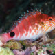 Cirrhitops mascarenensis measures between 6 and 7.5 cm. This fish is bicolore with a predominantly rouge and blanc body. The also has rouge vertical stripes.