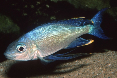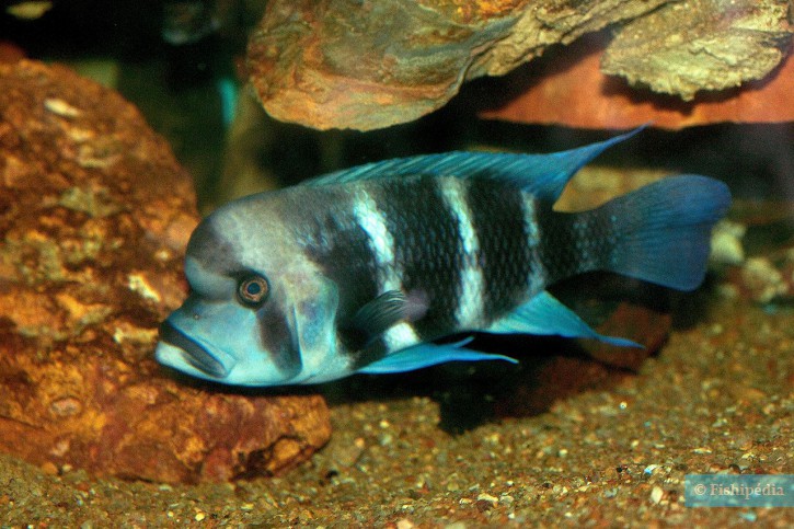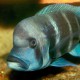 Cyphotilapia sp. North measures between 25 and 30 cm. This fish is bicolore with a predominantly bleu, argent and noir body.