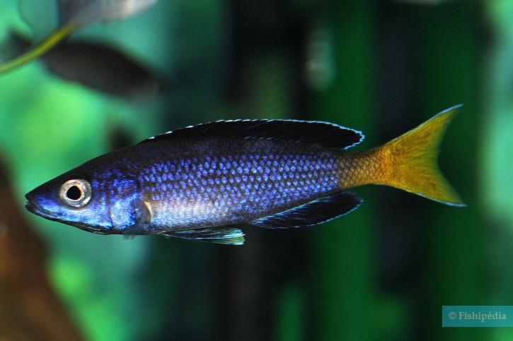 Cypri. sp. jumbo brillant measures around 12 cm. The dominant males can however reach 13 cm. This fish is bicolore with a predominantly jaune, bleu and noir body.