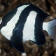 Dascyllus abudafur measures around 8 cm. The dominant males can however reach 10 cm. This fish is bicolore with a predominantly noir and blanc body. The also has noir vertical stripes.