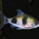 The aruli barb measures between 10 and 12 cm. This fish is tricolore with a predominantly jaune, orange and noir body. The also has noir vertical stripes.