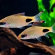 The mascara barb is a fish living in small groups naturally found at mid-depth. The members of each group are organized around a well established hierarchy. This species is omnivorous .