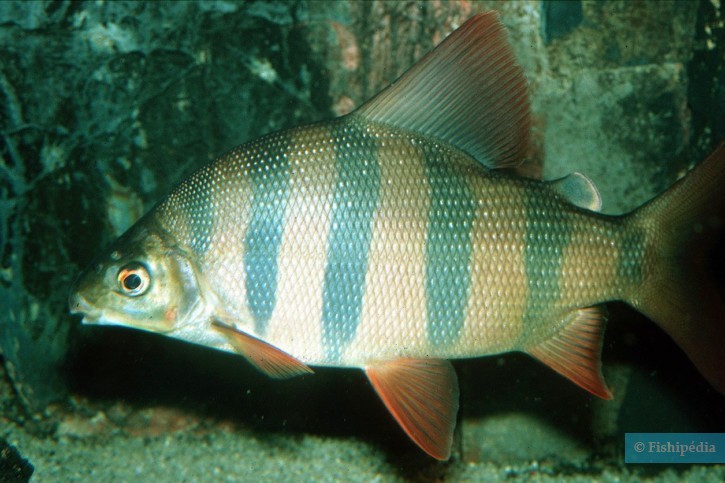 There are 60 to 66 scales along the body, 15 above the lateral line and 15 below. There are 23 scales around the caudal peduncle. When alive, the species is silvery, pink to reddish-brown on the body, whitish below. There are 6 black transverse bands on the flanks, the first on the nape and the last on the caudal peduncle. All fins are reddish.