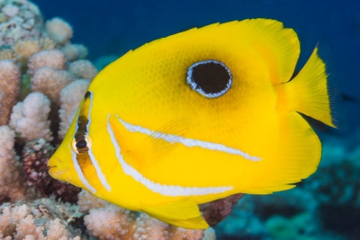 The long-nose butterflyfish measures between 20 and 22 cm. This fish is bicolore with a predominantly jaune and noir body.