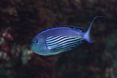 The spotbreast angelfish measures around 16 cm. The females are more imposing and some specimens can reach 18 cm. This fish is tricolore with a predominantly bleu, noir and gris body. The also has bleu and noir horizontal stripes.