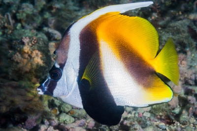 The red sea bannerfish measures between 16 and 18 cm. This fish is tricolore with a predominantly jaune, noir and blanc body. The also has noir diagonal stripes.