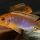 Iodotropheus sprengerae measures between 9 and 10 cm. This fish is bicolore with a predominantly orange and violet body.